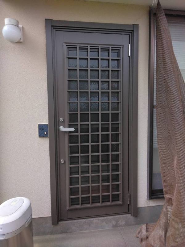 LIXILのリシェント勝手口ドア/アルミPG仕様/採風タイプ/A型井桁格子/オータムブラウン色です。格子の出幅をおさえたスマートなデザインになります。どうしても丁番のないデザインにしたい方は断熱・高断熱仕様をお選び頂くと、ピポッドヒンジを框の中に隠したデザインに変更可能です!