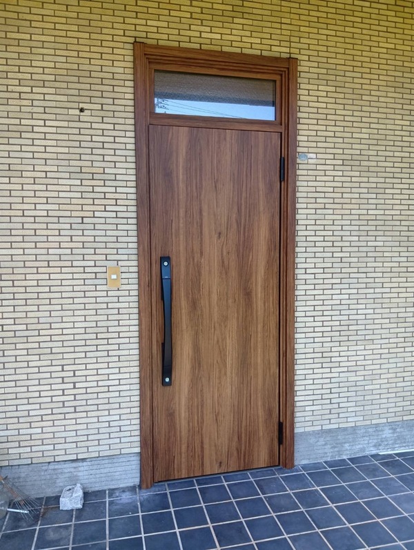 新しく採用したリシェントM17型は、欄間付きで光をしっかり取り込みながら、チークの色味が外壁タイルと自然に調和しています。現代的な印象と温かみのある玄関にリフォームできました。