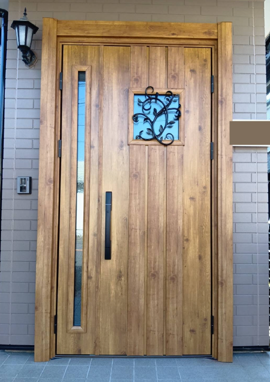 木目が美しいマキアートパイン色のドアに交換し、玄関全体が温かい印象になりました。鋳物の装飾が、上質な雰囲気をプラスしてくれています。スマートキーで開閉も簡単になり、デザイン性・機能性ともに大満足の仕上がりとなりました。