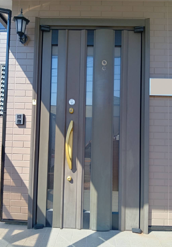 YKK APのドアリモ N13型(マキアートパイン)を採用しました。従来のアルミ色ドアから、木目調のデザインにしました。スリットガラスと鋳物飾りのついた小窓が、外からの光が入るので玄関全体を明るくしてくれます。さらに、スマートキー仕様で鍵の開閉もスムーズになったので、毎日の出入りも便利になりました!ドア1枚で家の印象が大きく変わる、そんなリフォームの魅力を感じていただける施工事例です!