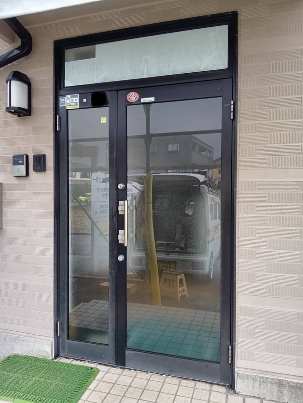 全面ガラスの親子ドアは明るい反面、経年劣化により下部が白くくすみ、防犯面にも不安を感じられていました。建て付けも徐々に悪化し、開閉音が気になる状態で、お客様は「このままで大丈夫なのか」と心配されていました。