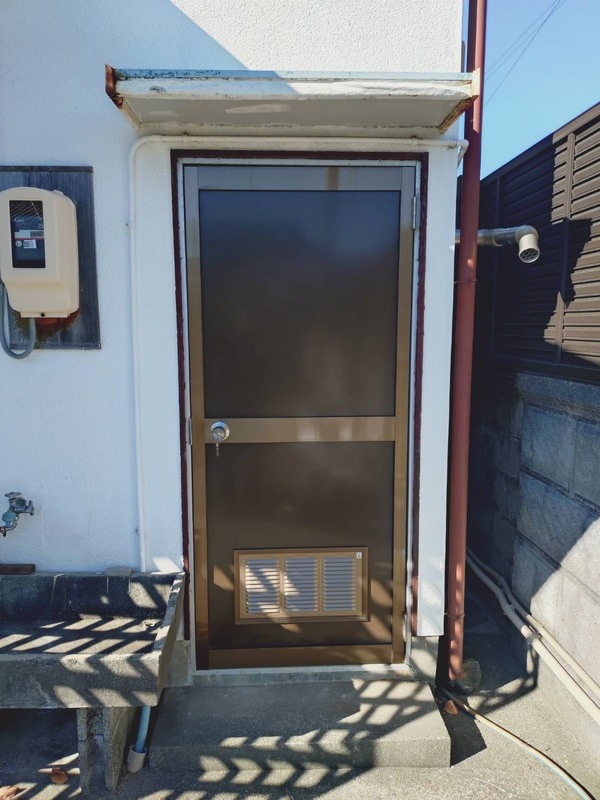 LIXILのアルミ製の框ドアに交換したことで、開閉はスムーズになり、施錠も確実にできるようになりました。アルミ製なので耐久性が高く、雨風の影響も受けにくくなりました。下部のガラリにより換気も可能で、裏口や物置に最適な快適ドアへ生まれ変わりました。
