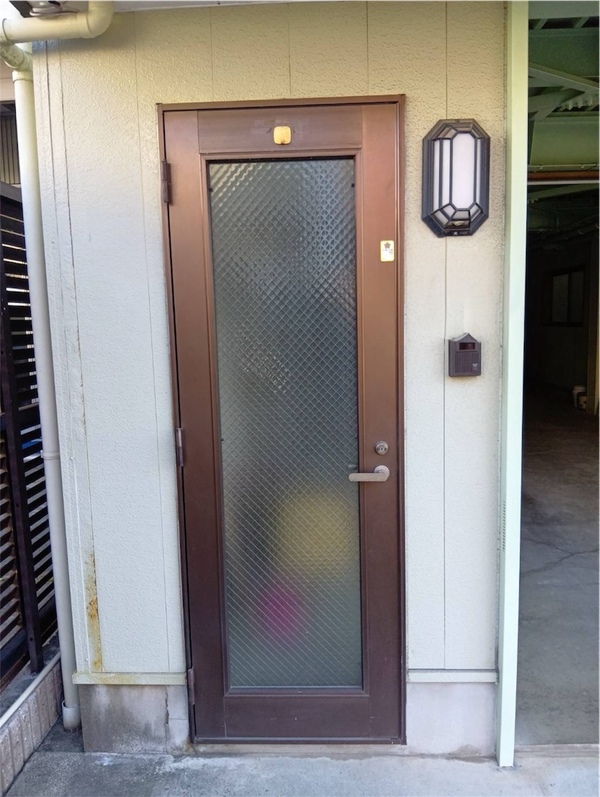 リフォーム前は全面ガラス仕様の玄関ドアでした。自然光が入り明るい反面、外から室内の様子や人の動きが分かってしまいそうで、防犯面に不安がありました。特に通りに面した立地のため、落ち着かない印象を感じておられました。