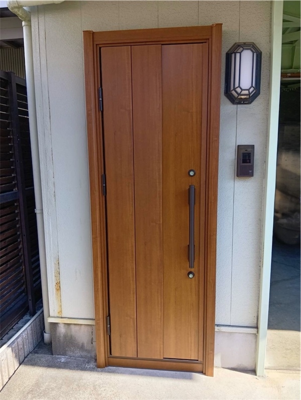 木目の質感が美しいLIXILリシェントに交換。ガラス面積を抑えたデザインにより、外部からの視線を遮り、防犯性が大幅に向上しました。鎌錠仕様で施錠時の安心感も高く、見た目と安全性を兼ね備えた玄関ドアに仕上がっています。