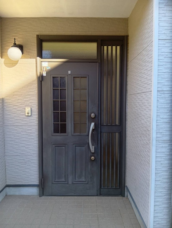 欄間付きの片袖ドアを長年使用していると、ドア本体の表面劣化や開閉の重さが気になってきます。今回はLIXILのリシェント玄関ドアを、アルミ仕様C12N型のオータムブラウンへリフォームしました。アルミ製玄関ドアは軽量で毎日の開閉が楽になり、錆びにくく耐久性が高い点が特長です。さらに比較的コストを抑えやすく、メンテナンスの手間を減らしたい方にもおすすめな兵信です。リシェントは壁を壊さないカバー工法で、たった1日で施工可能。快適さと安心感を手軽に高められる玄関リフォームです。
