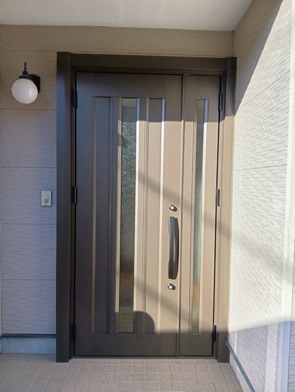 LIXILのリシェント玄関ドアC12N型へ交換し、外観はオータムブラウンで落ち着いた印象に。アルミ仕様で軽くなり、開閉もスムーズ。耐久性が高く、メンテナンスの手間も軽減されました。