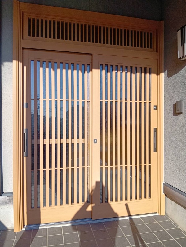古くなった玄関引戸を、和の趣を大切にしたデザインでリフォームしました。YKKAPのドアリモ引戸A02型の太桟格子を採用し、色は明るく上品なひのき調に。伝統和風の意匠が住まい全体の格を高め、訪れる人にやさしい印象を与えます。防犯面では複雑な形状のディンプルキーを採用し、ピッキング対策も万全。上下を選ばず使えるリバーシブル仕様で、日常の使い勝手も向上しました。